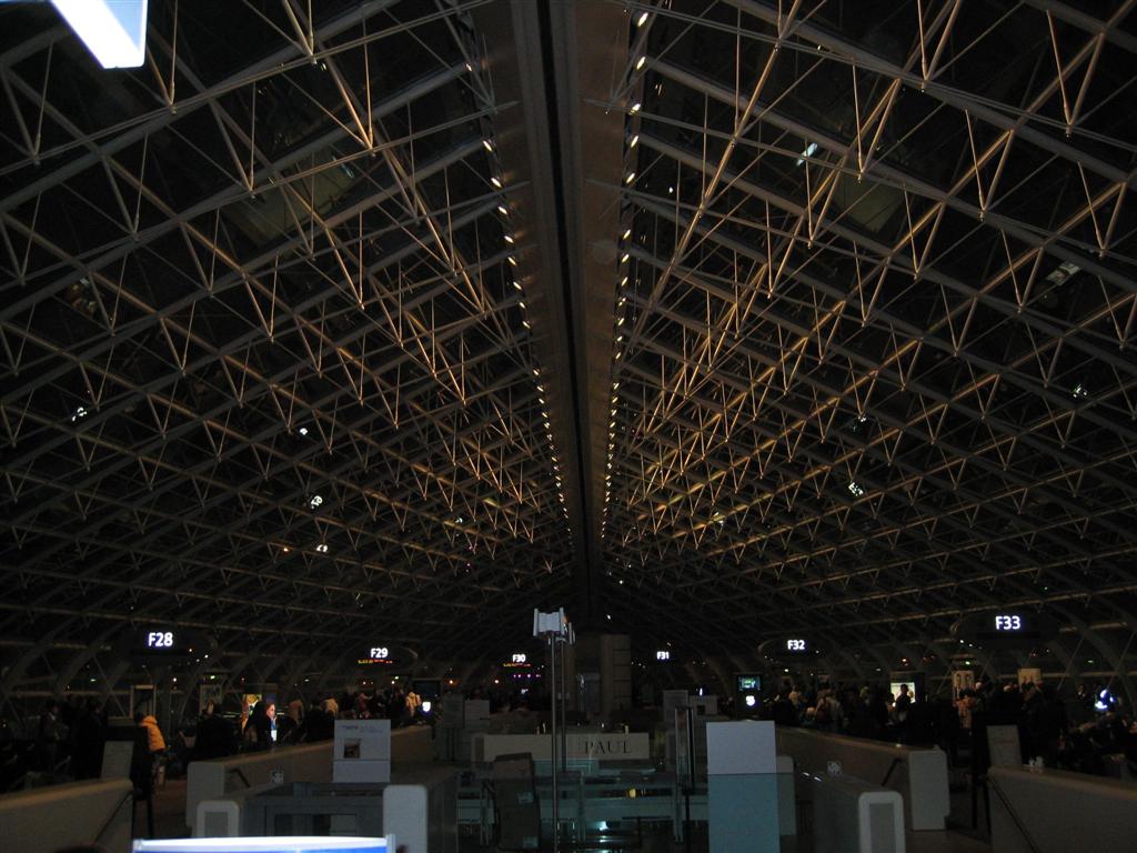 This is the ceiling of the airport. After Kristina was hand searched at the security gate (probably for only barely restraining herself from beating the crap out of the Air France stooges that kept dragging their feet with us, even after looking at our tickets and saying "oooh you are be very close") we sprinted through the airport only to find out that we had missed the flight. This was in spite of the big lighted sign that said our flight was still boarding. Did we mention that even as we ran up to the gate and pointed wildly at the door waving our tickets, the stewardess kept talking leisurely on the phone after dismissively waving her hand at us, then finally hung up the phone, looked at our ticket, said "oooh you are be very close", looked at her computer and then said "oh, no, is gone" and pointed us in the wrong direction (back through the security line) to go talk to someone else.