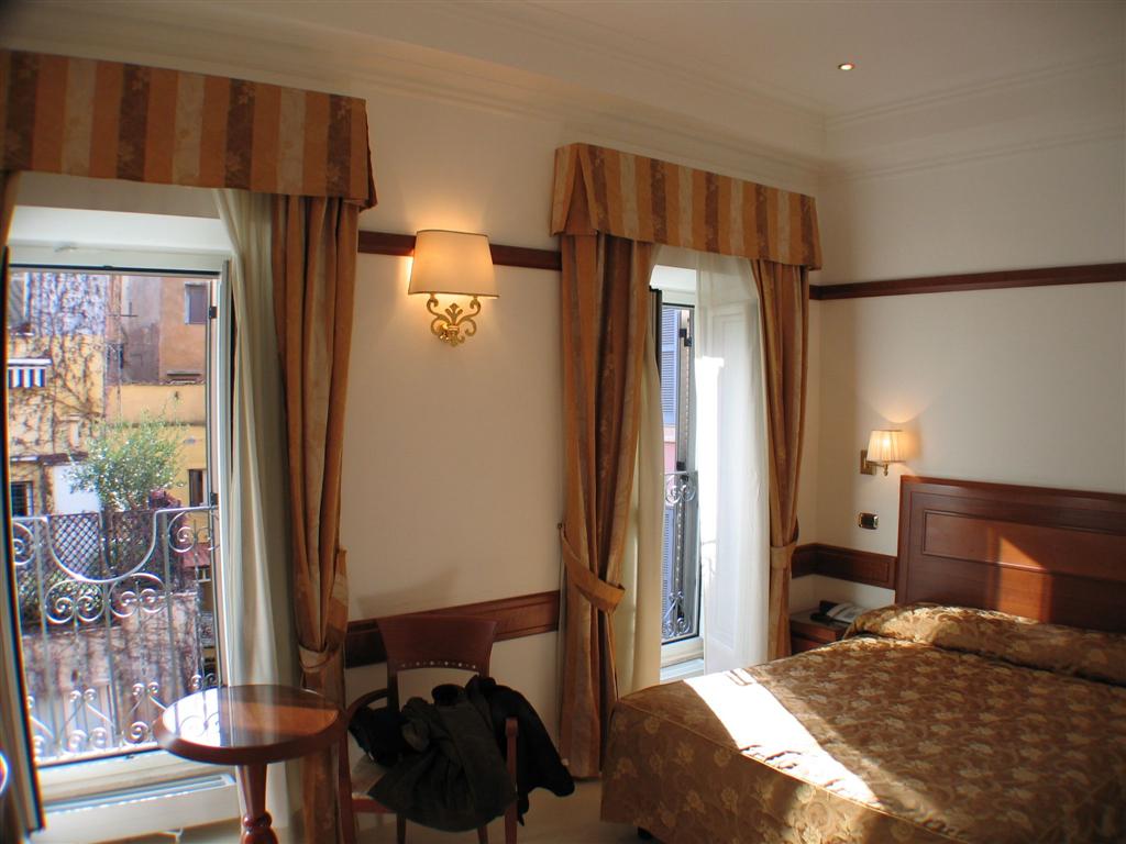 The Hotel San Carlo is situated on the corner of to very narrow streets, surrounded by fashion shops, little local eateries, and famous places. Our room is on the top floor, accessible by only a narrow, four flight staircase with marble steps. The room is modestly sized, with all tile floors, and no power outlets. Even with this shortcoming, it’s a marvelous room, with decorative iron shuttered windows, and an amazingly comfortable bed.