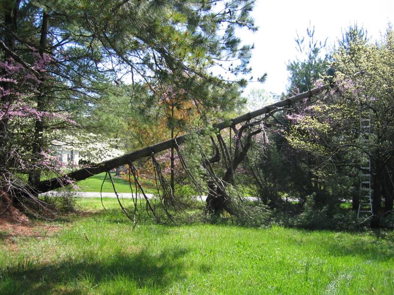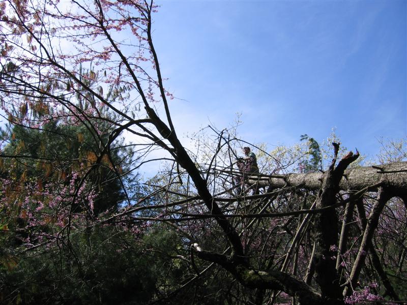 Ok, so here's the REAL beginning of the Habitat Destruction tour. One of the giant pines around the lake fell over in a recent storm, directly on top of a giant red bud tree and a dogwood. It was my job to climb up in the tree with a chain saw and start chopping stuff down. This sucker is about 30-40 feed up in the air.