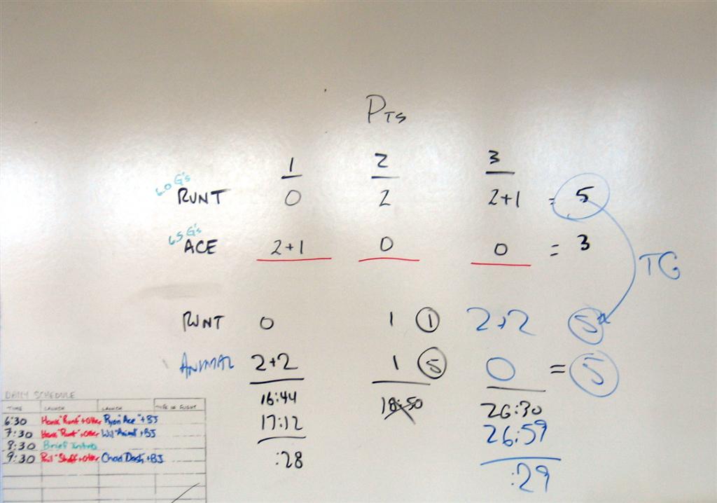 Final tally put's Hank firmly in the "Top Gun" slot, with a 5 point lead on the closest condender. Animal and Ace never had a chance, but Animal did take home the "G-Monger" (no it's not what you think, get your mind out of the Vegas gallery) award for pulling the most "G's": 7.9 positive and 3.0 negative, and the "Acrobat" award for not blowing his cookies during a Torque Roll, Hammerhead w/ snap rolls, and a full Outside loop. See the videos for a idea of what that all entails.