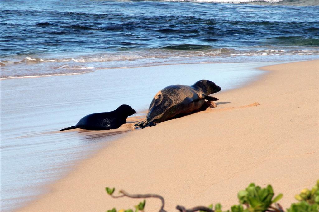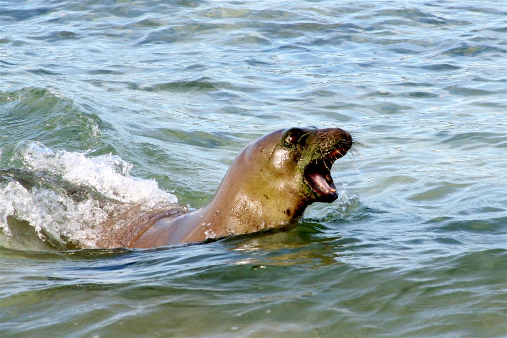 This is one of the Monk seals that like to hang out on Poipu beach. This is the Mom seal, barking to find her pup in the surf.