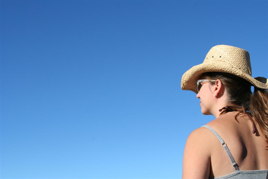 Kristina gets ready for the boat tour. We had beautiful weather for most of the trip, as evidenced by the skyline.