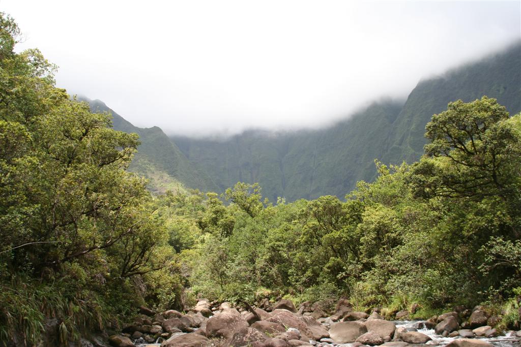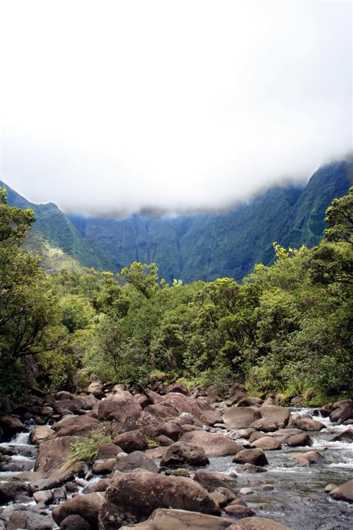 Here's another shot, from standing in the middle of the stream. The clouds had just started pulling back and the rain held off just long enough for us to get within 1/4 mile of the car before drenching us. I've attempted some photoshop trickery to get the mountains in the back a little clearer.