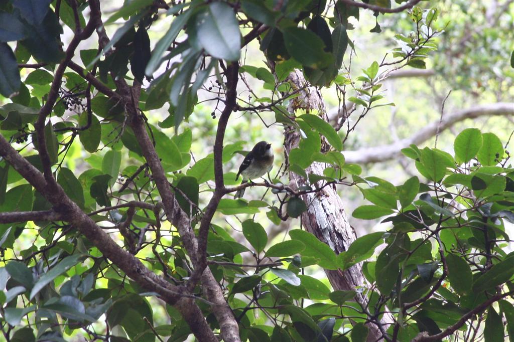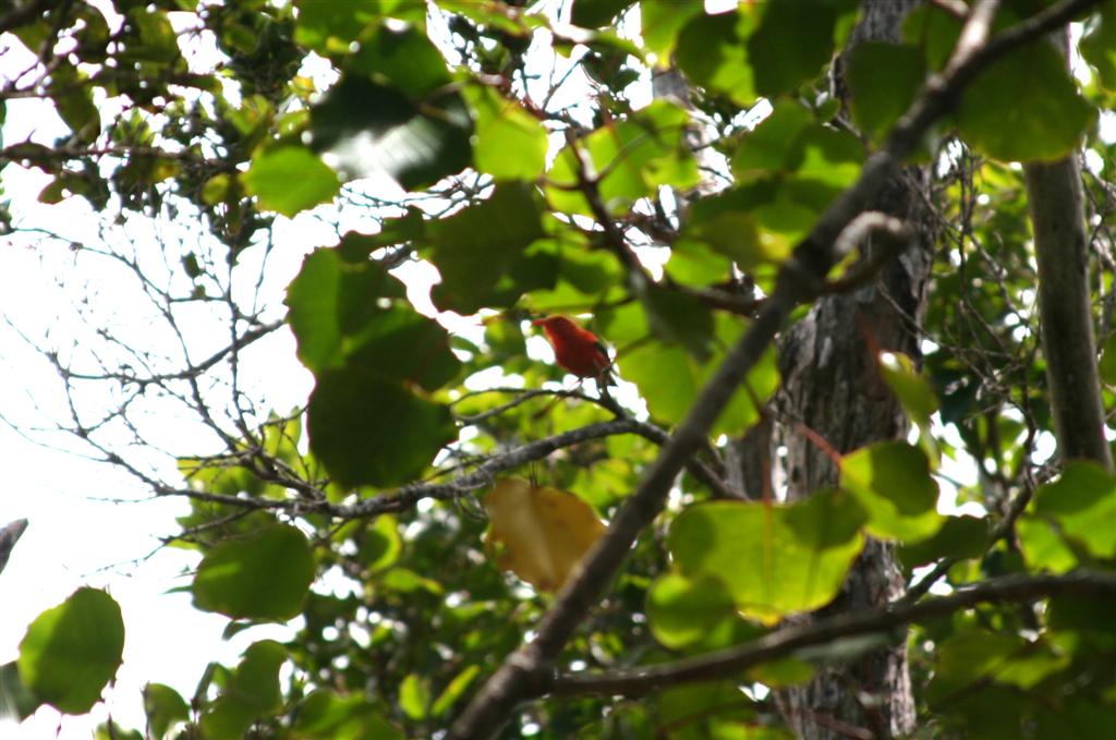 This is one of Kauai's native birds, the iiwi, along the swamp trail. This is the best of about 30 photos worth of leaves with a red splotch in them.