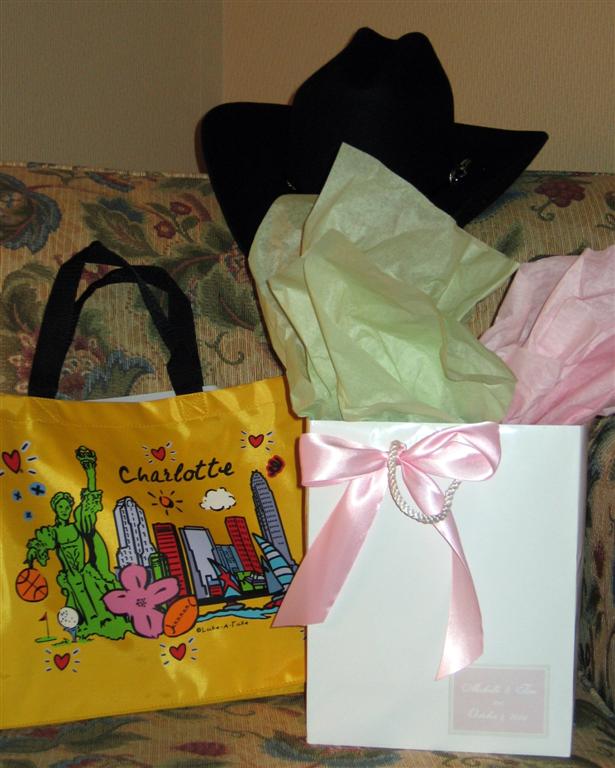 Upon returning to the Hotel, I got checked in, and found that Michelle's mom is a planning goddess. Waiting for me was a fancy gift basket and a ton of "What to do in Charlotte" information. In the basket there was a play by play guide to the entire weekend, complete with directions, attire, timing, the whole nine yards.