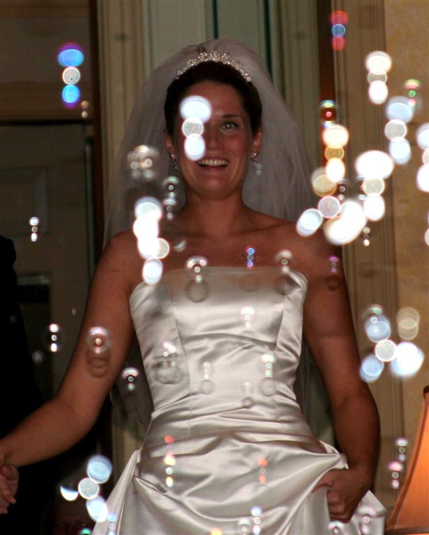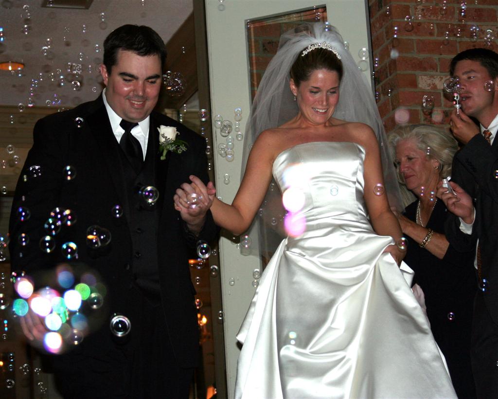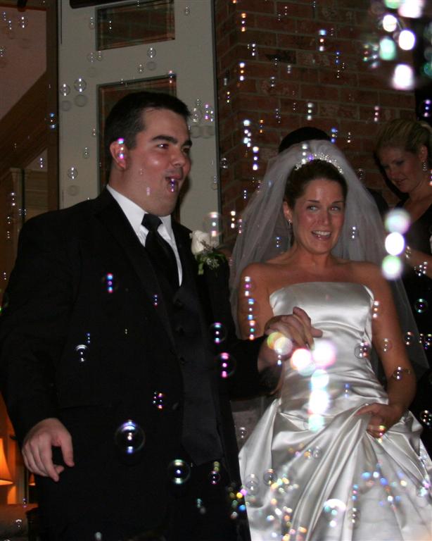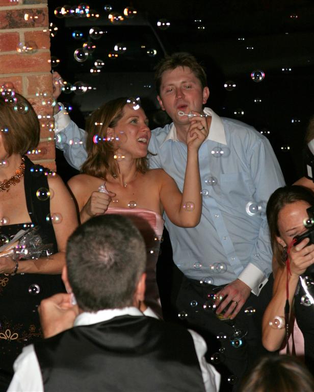Random party goers fooled some particularly inebriated guests into blowing bubbles for them. Silly people, that's not the bride and groom!