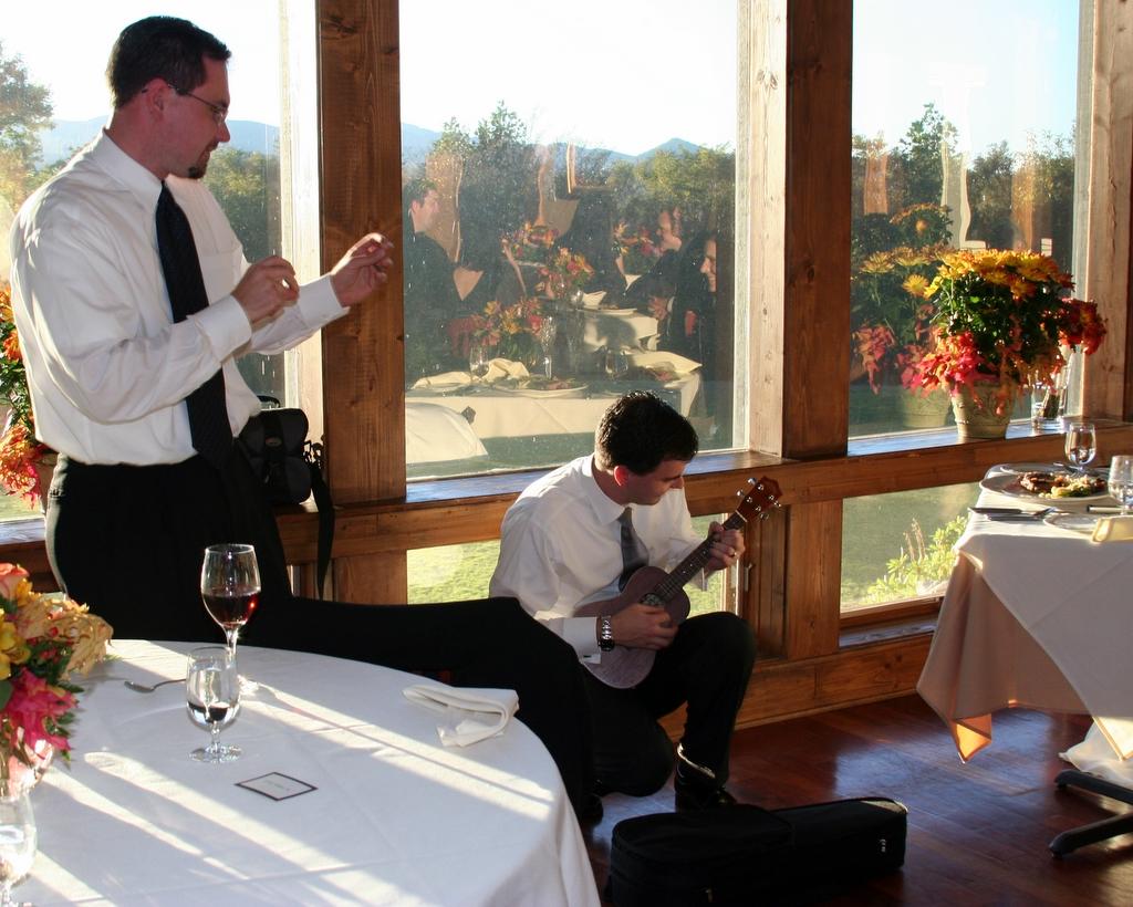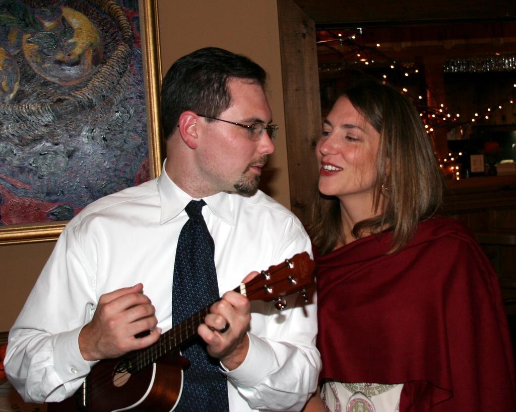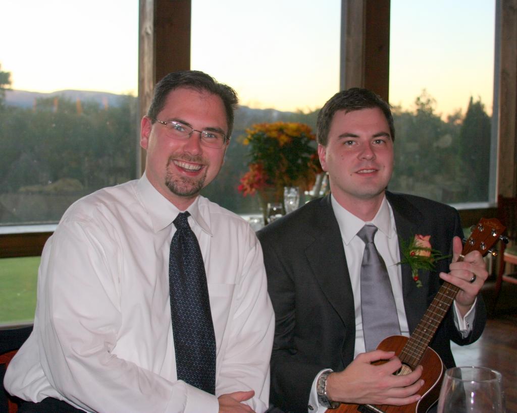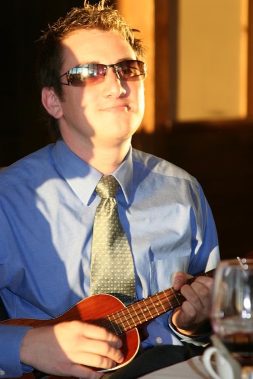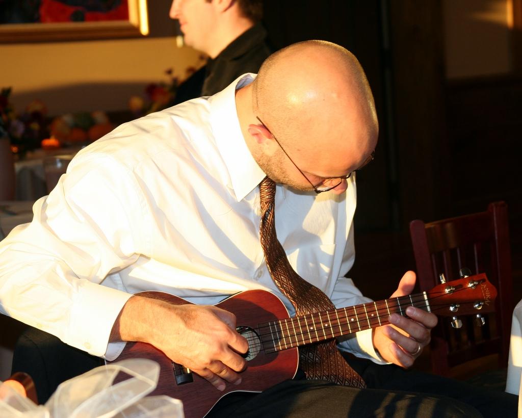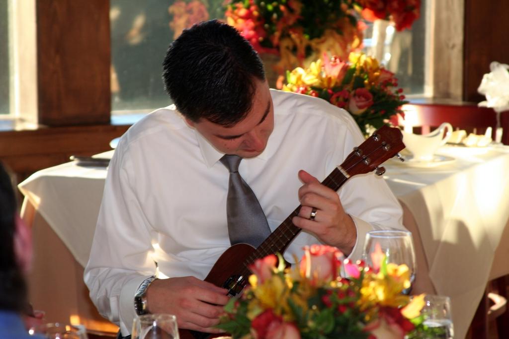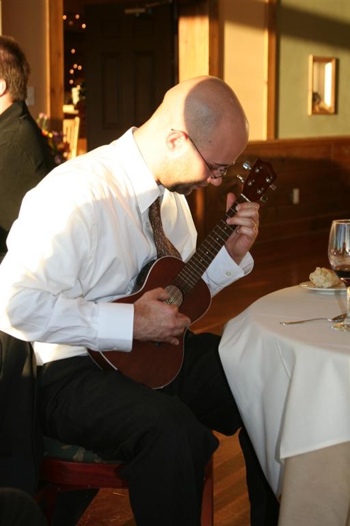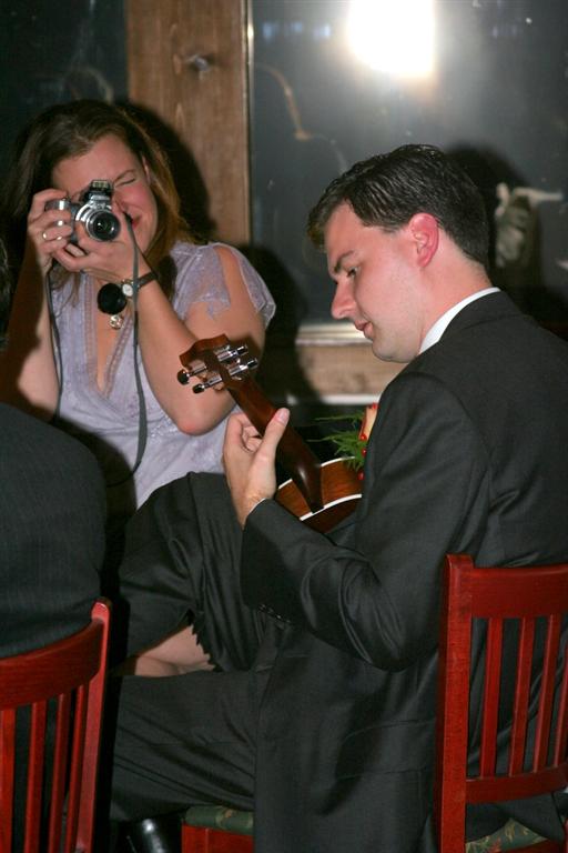 Will presents Ben with his birthday present. It's a ukelele from Kauai with an electric pickup and a hardshell case. Several people were seen struggling with the decision "Do I pose with the bride, or the Uke?" throughout the night