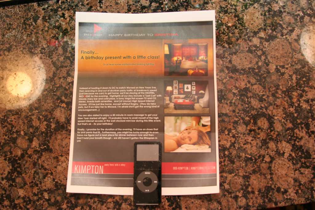 Will also got Kristina an iPod Nano, and an evening at a swanky downtown hotel, with a massage in the morning. (You won't see pictures of that here...)