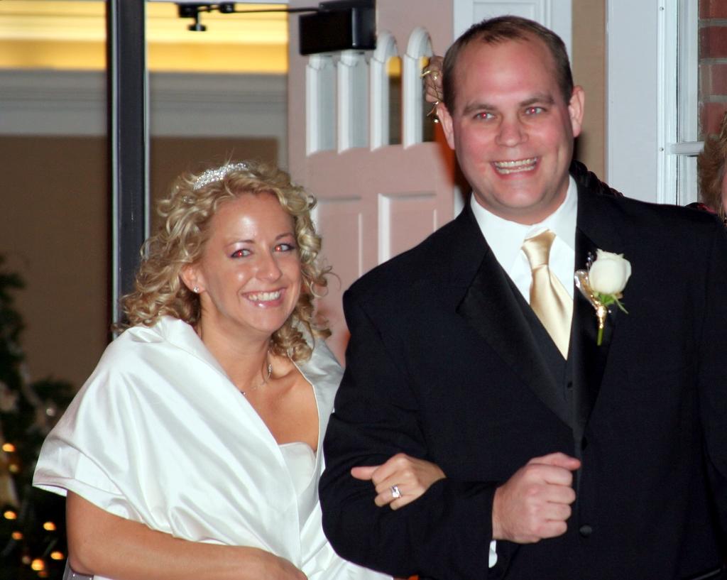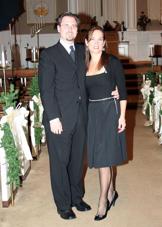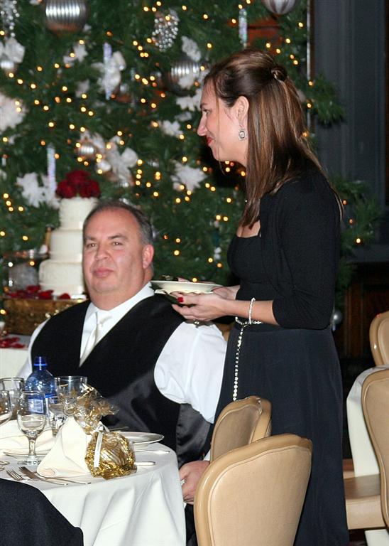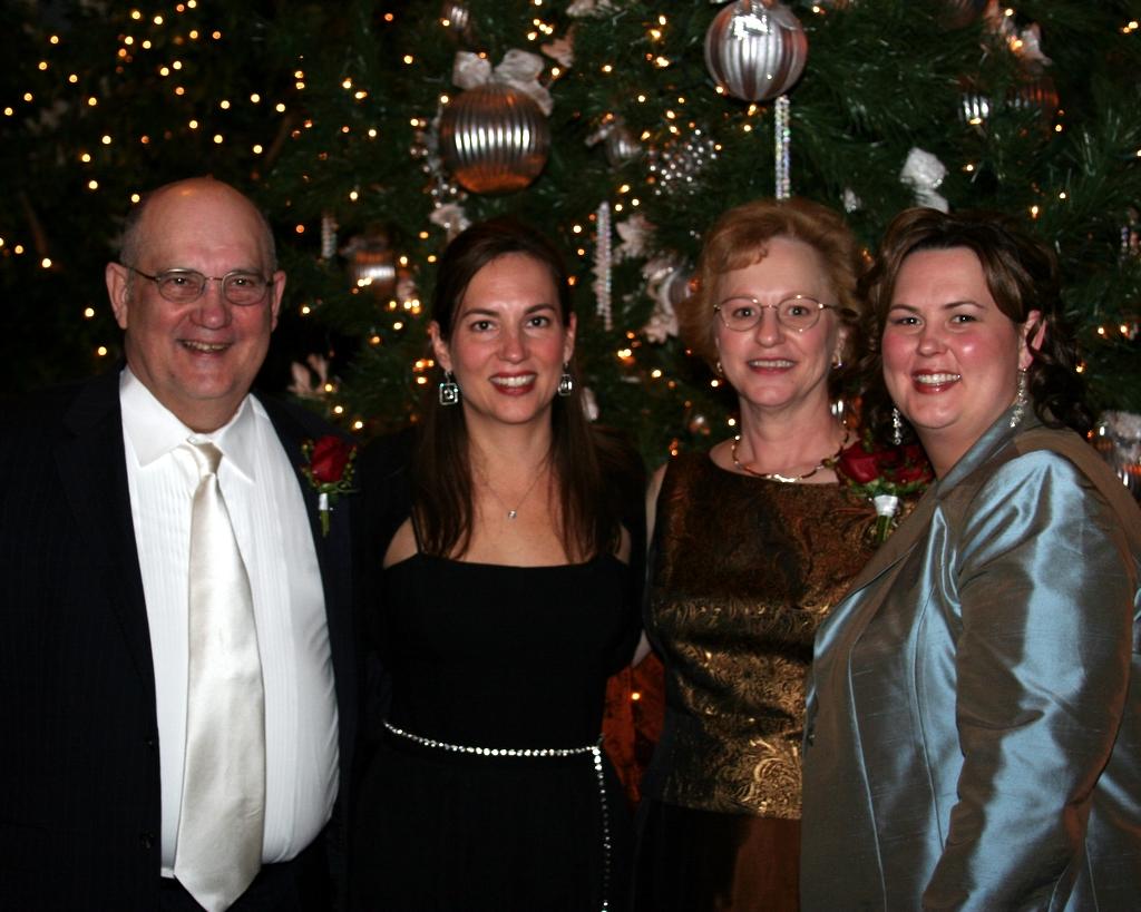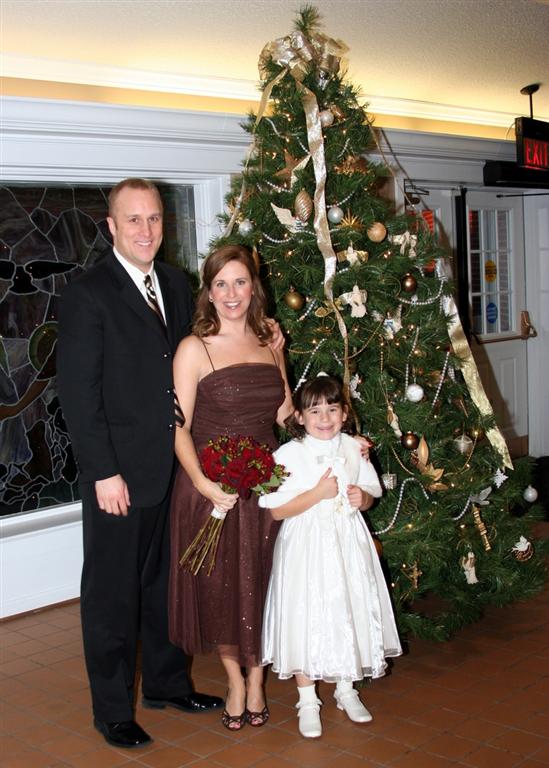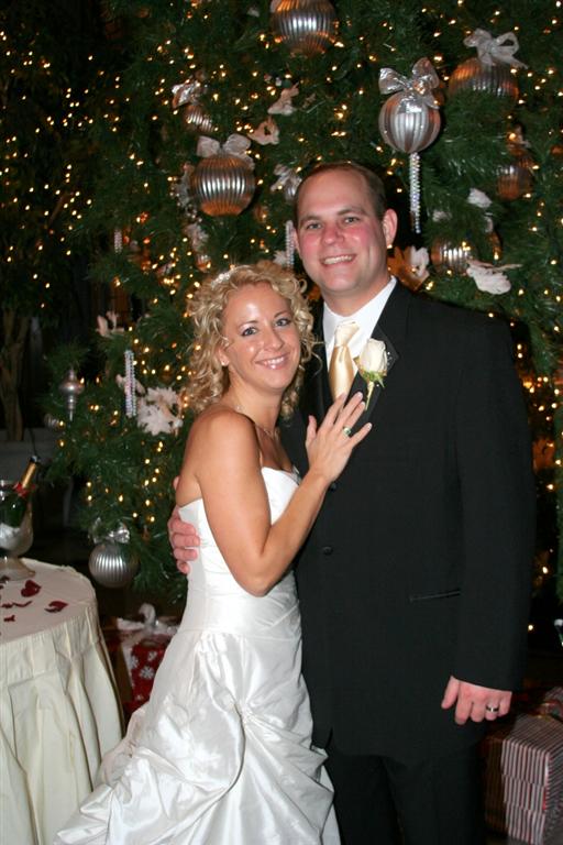 Ok, skipping ahead some, here's the recently wedded bride and groom, beaming in front of the giant Christmas tree in the Columbia Club at the reception.