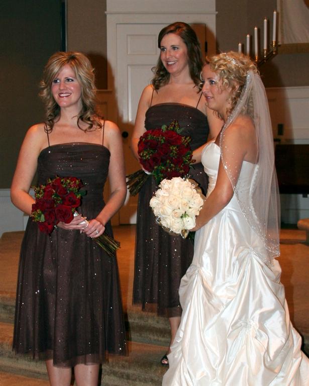 The bride and bridesmaids and some flowers.