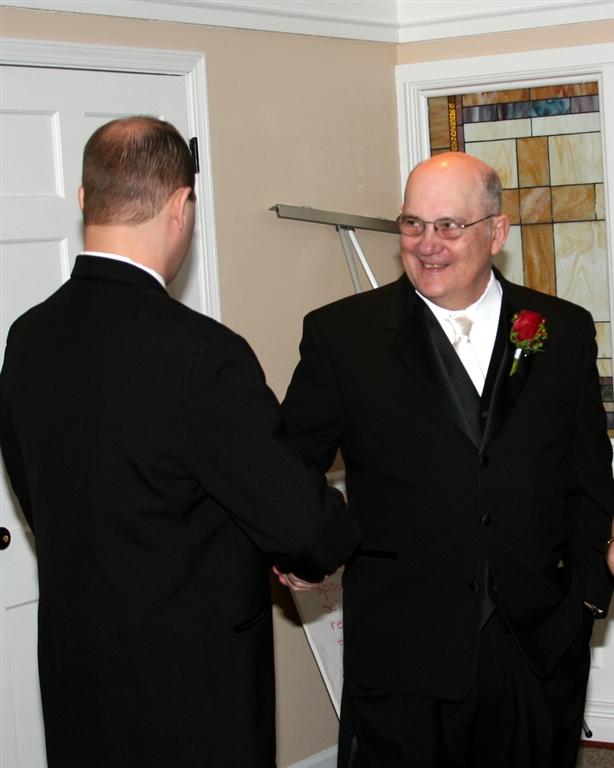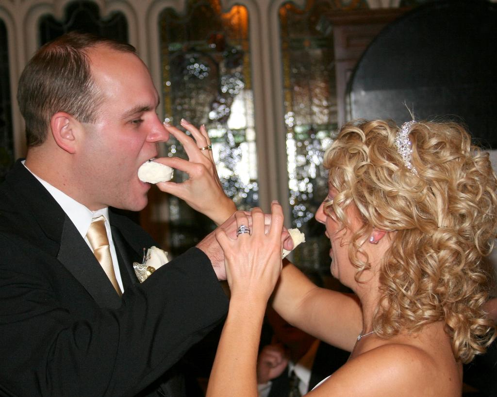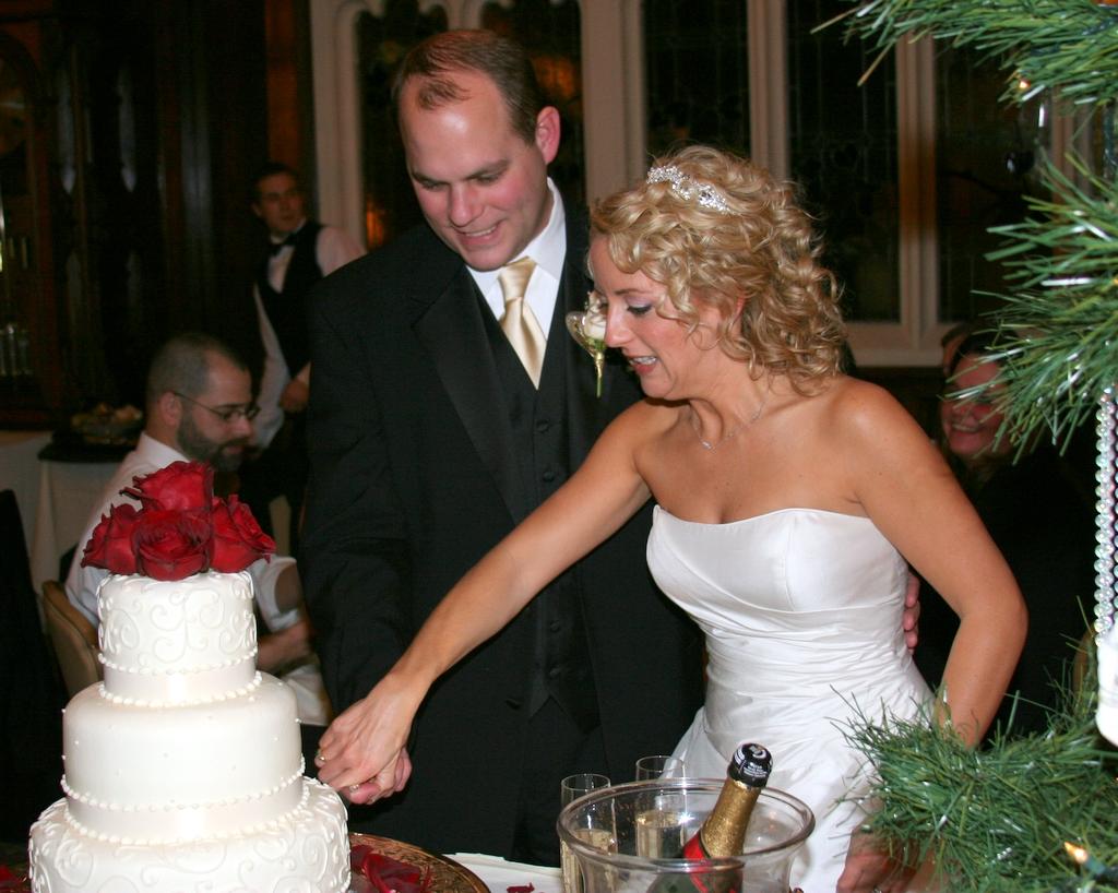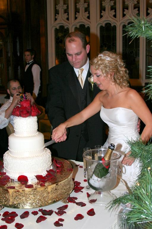 The fancy wedding cake. Ryan and Tracy staged a fake cutting for the wedding photographer, leaving the real cutting to yours truly. Funny how none of the cutting pictures turned out all that well.