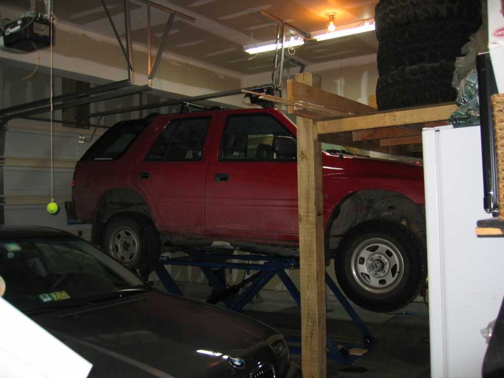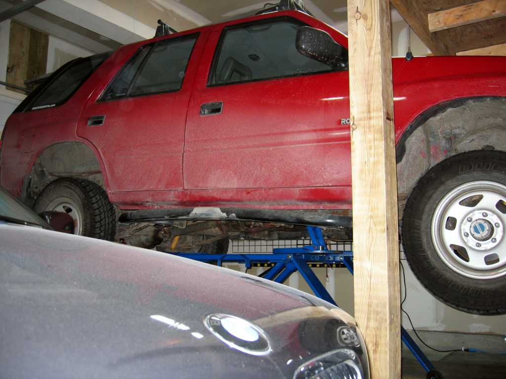 The Rodeo also got a ride on the lift, although it was a little more precarious - the garage door opener comes within a few inches of the roof.