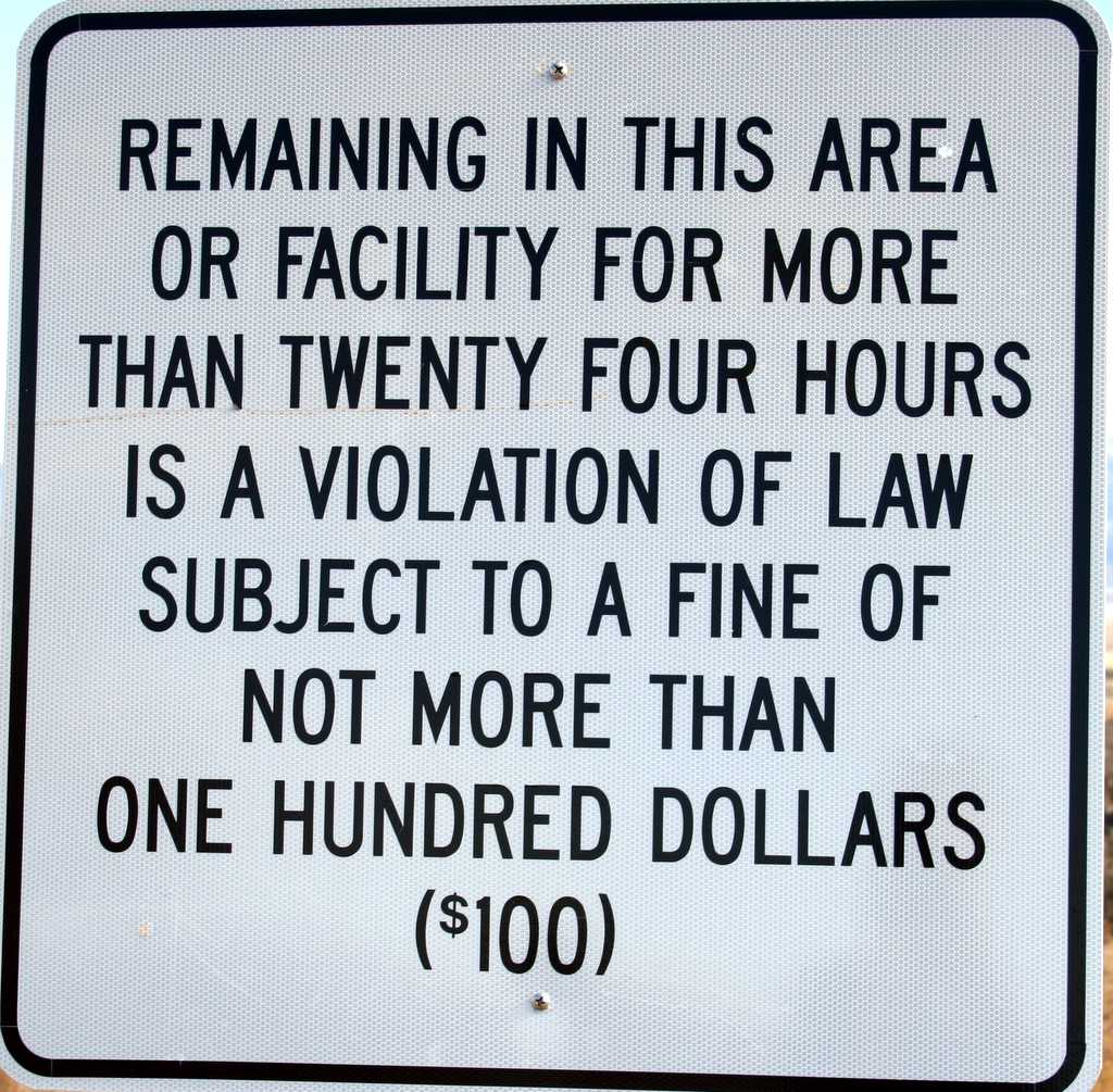 Luckily we spotted this warning and got out of dodge before we were subject to a fine of no more than one hundred dollars. ($100)