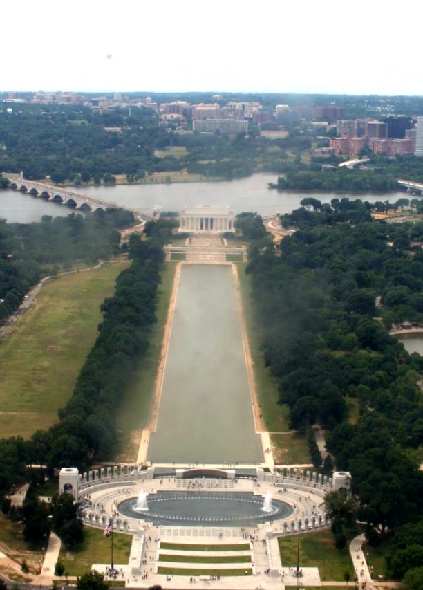 Looking out over the Lincoln Memorial and the reflecting pool from the Washington Monument. The glass was a little dirty, so you'll have to forgive the fuzzy spots.